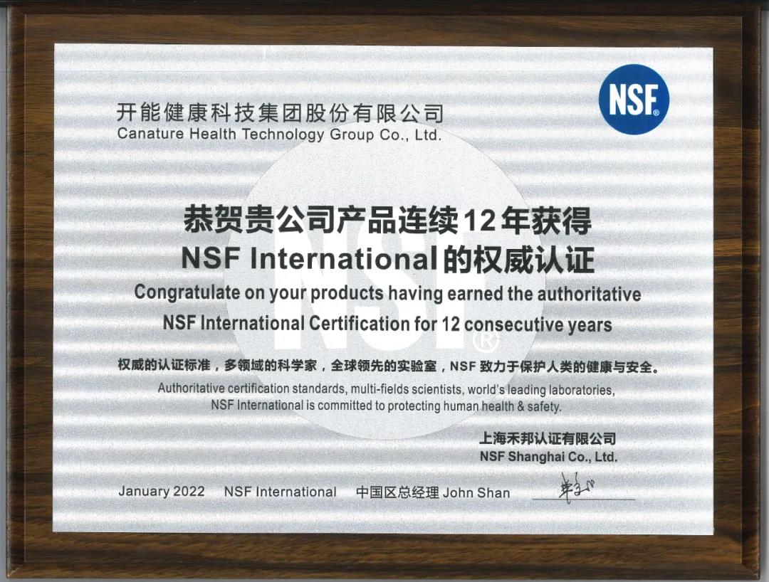 NSF International是一個(gè)全球獨(dú)立、不以盈利為目的的非政府組織,NSF專致于公共衛(wèi)生、安全、環(huán)境保護(hù)領(lǐng)域的標(biāo)準(zhǔn)制訂、產(chǎn)品測試和認(rèn)證服務(wù)工作,是公共衛(wèi)生與安全領(lǐng)域的權(quán)威機(jī)構(gòu)。2021年,開能產(chǎn)品順利通過NSF的重新測試,NSF Shanghai Co,.Ltd.特此為開能頒發(fā)獎(jiǎng)牌。