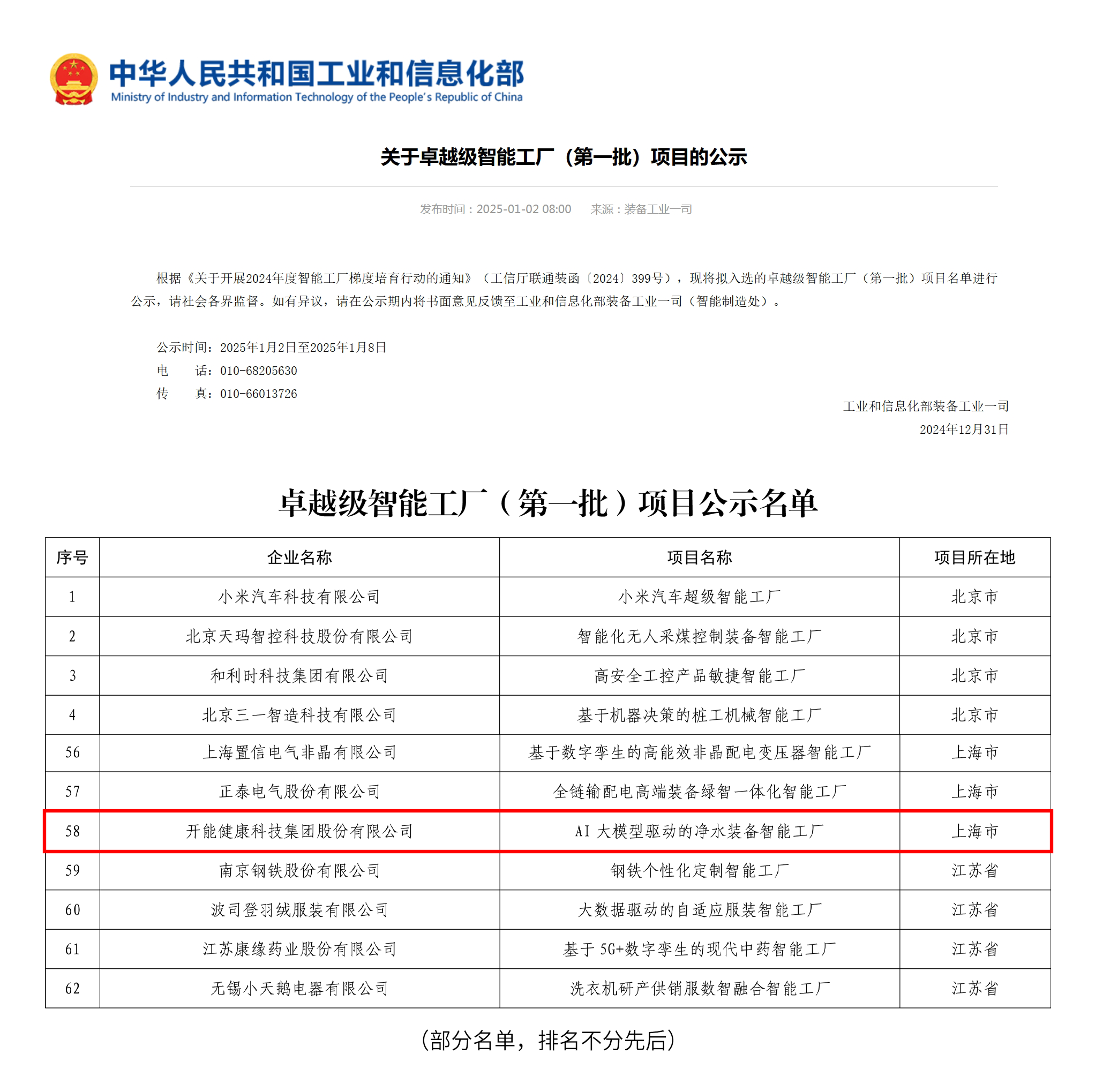 新年伊始,開能健康科技集團(tuán)股份有限公司(以下簡稱“開能健康”)在智能制造領(lǐng)域?qū)崿F(xiàn)了開門紅。近日,工信部公示了全國首批卓越級智能工廠項(xiàng)目名單,開能健康以“AI大模型驅(qū)動(dòng)的凈水裝備智能工廠”項(xiàng)目成功入選,這是對公司長期以來堅(jiān)持技術(shù)創(chuàng)新和數(shù)字化轉(zhuǎn)型的高度肯定。這也是繼榮獲“國家級綠色工廠”和“國家服務(wù)型制造示范企業(yè)”稱號后,開能健康再次獲得的國家級榮譽(yù)。
